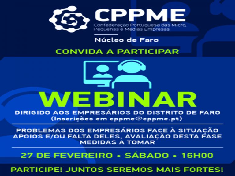 O Núcleo de Faro da CPPME realiza no próximo sábado, dia 27 de Fevereiro, pelas 16h00, uma reunião online via ZOOM com associações e empresários