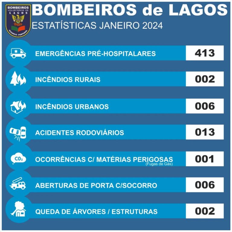 Os operacionais intervieram, também, em seis incêndios urbanos e dois rurais. No mês de Janeiro de 2024, os Bombeiros Voluntários de Lagos acorreram a 13