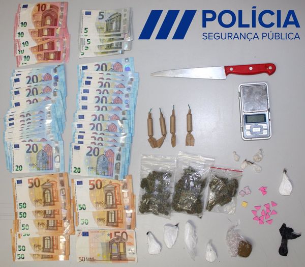 Foram apreendidas cerca de 250 doses de anfetaminas, cocaína, liamba e haxixe, além de quatro engenhos pirotécnicos, uma faca e 1.355 euros, que as autoridades