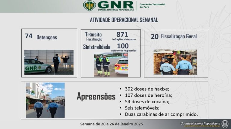 Apreendidas 302 doses de haxixe, 107 de heroína e 54 de cocaína, a que se juntam seis telemóveis, três relógios, duas carabinas de ar comprimido, duas chapas de
