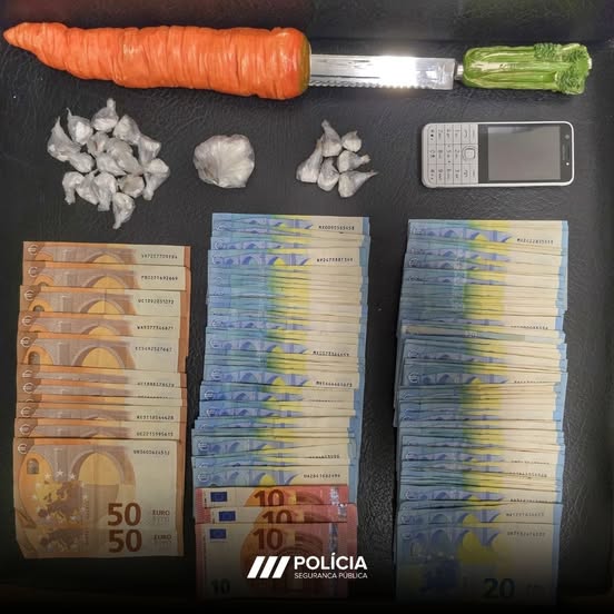 E prossegue: “Em ato contínuo, o suspeito injuriou e ameaçou os polícias com recurso a uma arma branca, no momento em que estes se identificaram através da exibição da sua carteira profissional, tendo sido possível cessar com ameaça e imobilizar o suspeito. Com o auxílio da Esquadra de Investigação Criminal de Faro, na sequência de revista ao suspeito e busca domiciliária foram apreendidas 197 doses individuais de cocaína, uma arma branca com o comprimento total de 30 cm e cerca de 3.100€ em dinheiro.” Na foto divulgada pela PSP, também é possível ver-se um telemóvel.