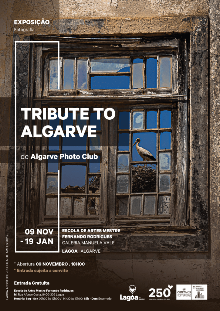 A partir do dia 10 de novembro e até 19 de janeiro de 2024 a Exposição de Fotografia “Tribute To Algarve” poderá ser visitada de segunda-feira a sexta-feira das 09h30 às 12h00 e/ou das 14h30 às 17h00.