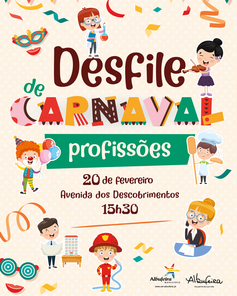A encerrar as comemorações, no mesmo dia, às 15h30, acontece o Desfile de Carnaval dos estabelecimentos escolares e instituições locais. Cerca de 550 crianças e adultos participam nesta divertida parada pela Avenida dos Descobrimentos, com início marcado para as 15h30. O troço que vai dos Bombeiros Voluntários de Albufeira até à Rotunda dos Relógios é o palco escolhido para mostrar a criatividade dos participantes, miúdos e graúdos, sobre o tema as “Profissões”.