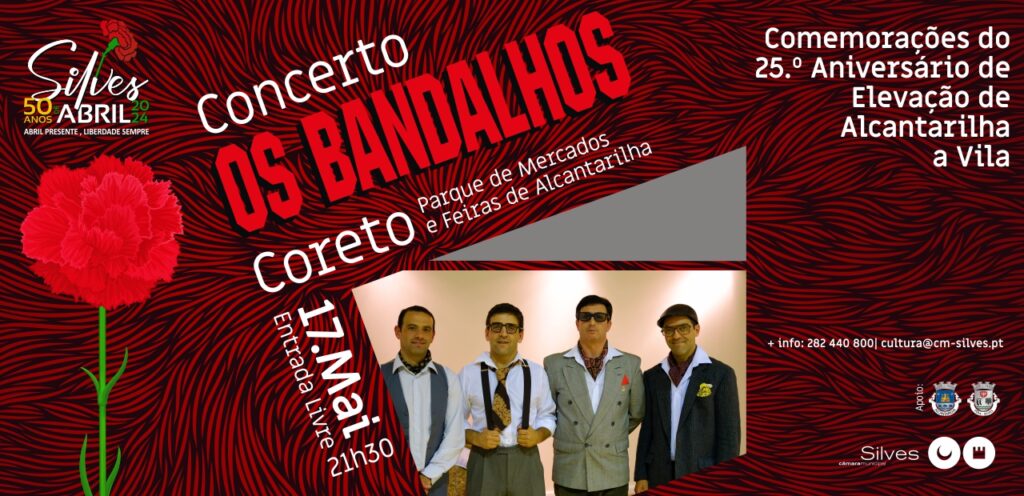 Para comemorar o 25.º Aniversário da Elevação a Vila de Alcantarilha, irá ter lugar o concerto “OS BANDALHOS”, no dia 17 de maio, pelas 21h30, no Coreto do Parque de Feiras e Mercados de Alcantarilha.