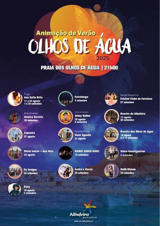 Com um programa composto por atuações de diversos artistas e grupos locais, o verão em Olhos de Água tem contado com vários momentos de animação. Os primeiros espetáculos aconteceram já na última semana, e a programação prolonga-se até ao final do mês de setembro. Os momentos acontecem na Praia dos Olhos de Água, sempre a partir das 21h00. A entrada é gratuita.