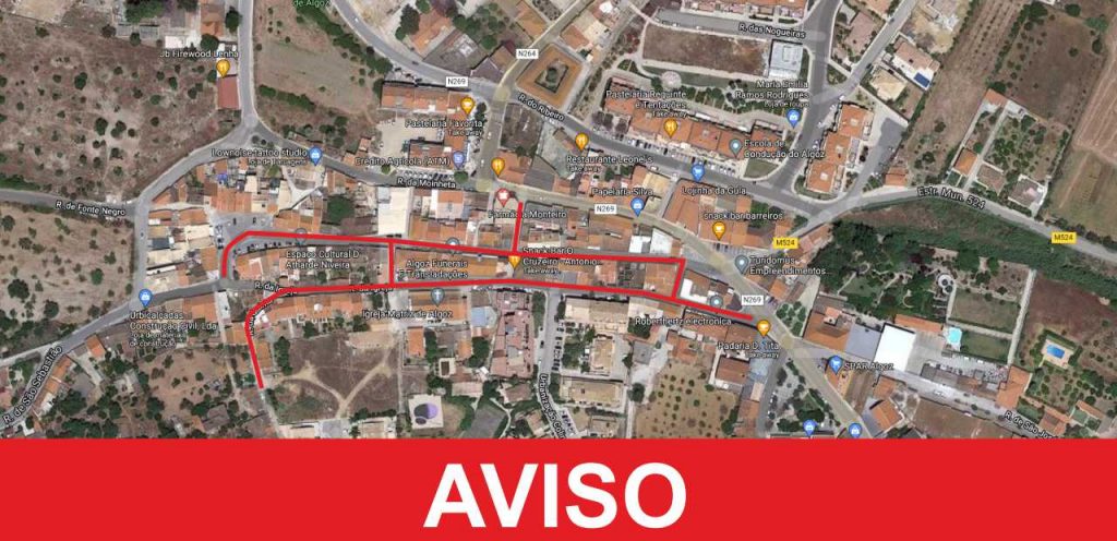 A Câmara Municipal de Silves informa que, no âmbito da empreitada de “Repavimentação de Arruamentos na Baixa do Algoz”, a circulação de trânsito nas ruas da Baixa de Algoz – Rua da Quinta, Rua da Igreja, Travessa da Igreja, Travessa Dr. Casimiro M. Neto, Rua Tomé Rodrigues Pincho, Travessa Tomé Rodrigues Pincho, estará interrompida a partir do dia 12 de julho tendo a duração prevista de 30 dias.