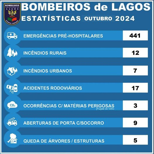 No mês de Outubro de 2024, a corporação dos Bombeiros Voluntários de Lagos acorreu a 441 emergências pré-hospitalares (menos quatro em comparação com Setembro deste ano, em que foram registadas 445), a 17 acidentes rodoviários (mais um face ao mês anterior) e a 12 incêndios rurais, o que representa menos doze.