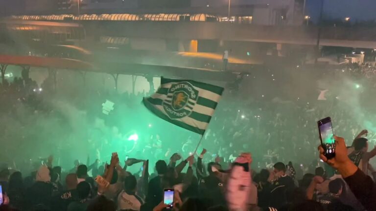 Entre saltos, gritos e cânticos, ouviu-se: “Campeões! Campeões! Nós somos campeões!” Adeptos, a pé e em viaturas, exibiram bandeiras e cachecóis do Sporting Clube de
