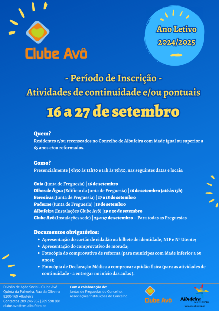 Setembro volta a marcar o início de mais um ano letivo do Clube Avô. O projeto, integrado na Divisão da Ação Social do Município de Albufeira, tem por objetivo a promoção e o desenvolvimento de atividades que melhorem o bem-estar físico e a qualidade de vida da população sénior do concelho. A primeira fase de inscrições decorre de 16 a 27 de setembro, sendo que posteriormente serão apenas aceites inscrições de 6 a 31 de janeiro de 2025. Este ano letivo a programação inclui atividades como a dança, pilates, ginástica, cantares, passeios e muito mais. Junte-se a nós! Para mais informações, contacte: 289 598 881 | 289 246 962 ou clube.avo@cm-albufeira.pt.