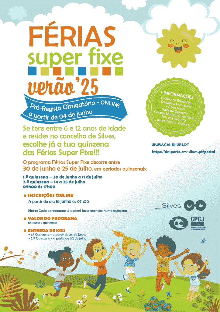 A Câmara Municipal de Silves promove, entre 30 de junho e 25 de julho de 2025, mais uma edição das “FÉRIAS SUPER FIXE”, um programa de ocupação de tempos livres destinado a crianças e jovens, dos 6 aos 12 anos, do concelho, repleto de atividades lúdicas, desportivas e educativas.