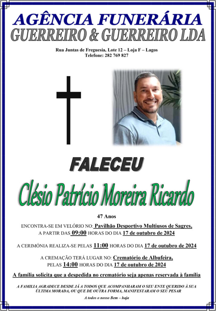 A Agência Funerária Guerreiro & Guerreiro, Lda., com sede em Lagos, anuncia que as exéquias fúnebres de Clésio Patrício Moreira Ricardo, nascido em Lagos, a 08 de Maio de 1977, na então de Freguesia de Santa Maria, e falecido a 12 de Outubro de 2024, realizam-se a partir das11.00 horas desta quinta-feira, dia 17, no PavilhãoDesportivo Multiusos de Sagres, onde o corpo chega às 09.00 horas.