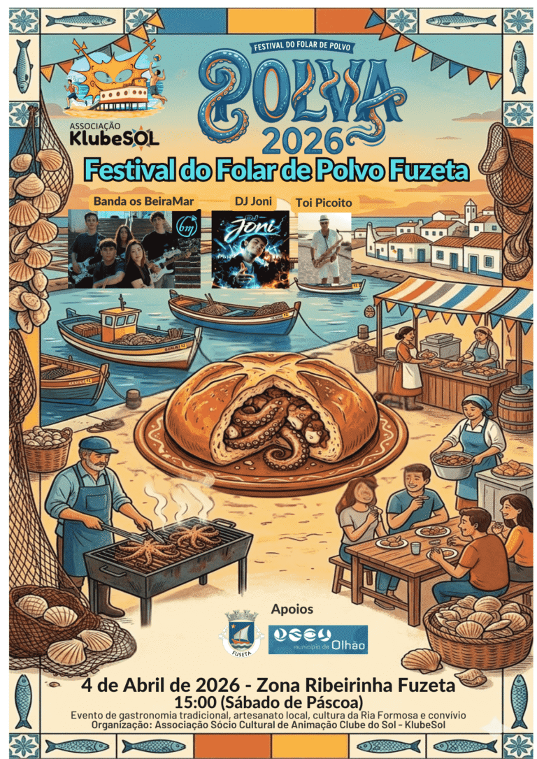 A vila da Fuzeta prepara-se para acolher um evento inédito que promete despertar a curiosidade a nível nacional. No próximo 4 de abril de 2026, a partir das 15h00, a zona ribeirinha será palco do FESTIVAL POLVA 2026 – Festival do Folar de Polvo da Fuzeta, o primeiro festival em Portugal dedicado ao Folar de Polvo com Salicórnia da Ria Formosa.