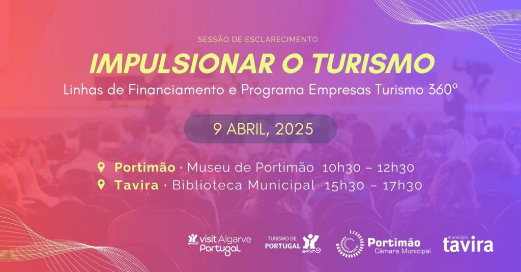 O Turismo do Algarve convida-o(a) a participar na sessão de esclarecimento Impulsionar o Turismo: Linhas de Financiamento e Programa Empresas Turismo 360º, no dia 9 de abril, às 10h30, no Museu de Portimão, e às 15h30, na Biblioteca Municipal de Tavira.