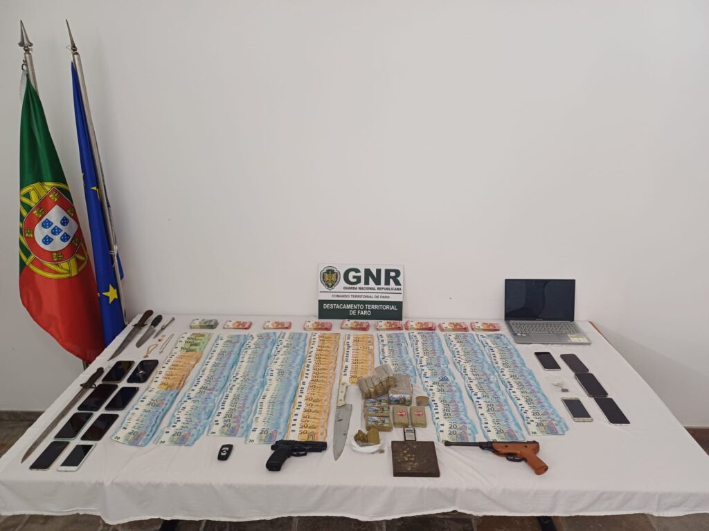 Foram apreendidos 20.994 euros, 3.519 doses de haxixe, cinco de cocaína, três de MDMA e uma de canábis, 13 telemóveis, armas, um computador e um veículo de alta cilindrara, entre outros produtos