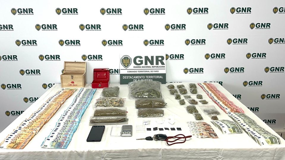 Militares da GNR de Albufeira apreendem, em zonas de diversão noturna da cidade, 3.730 euros e 406 doses de liamba, cocaína e haxixe, entre outros produtos estupefacientes