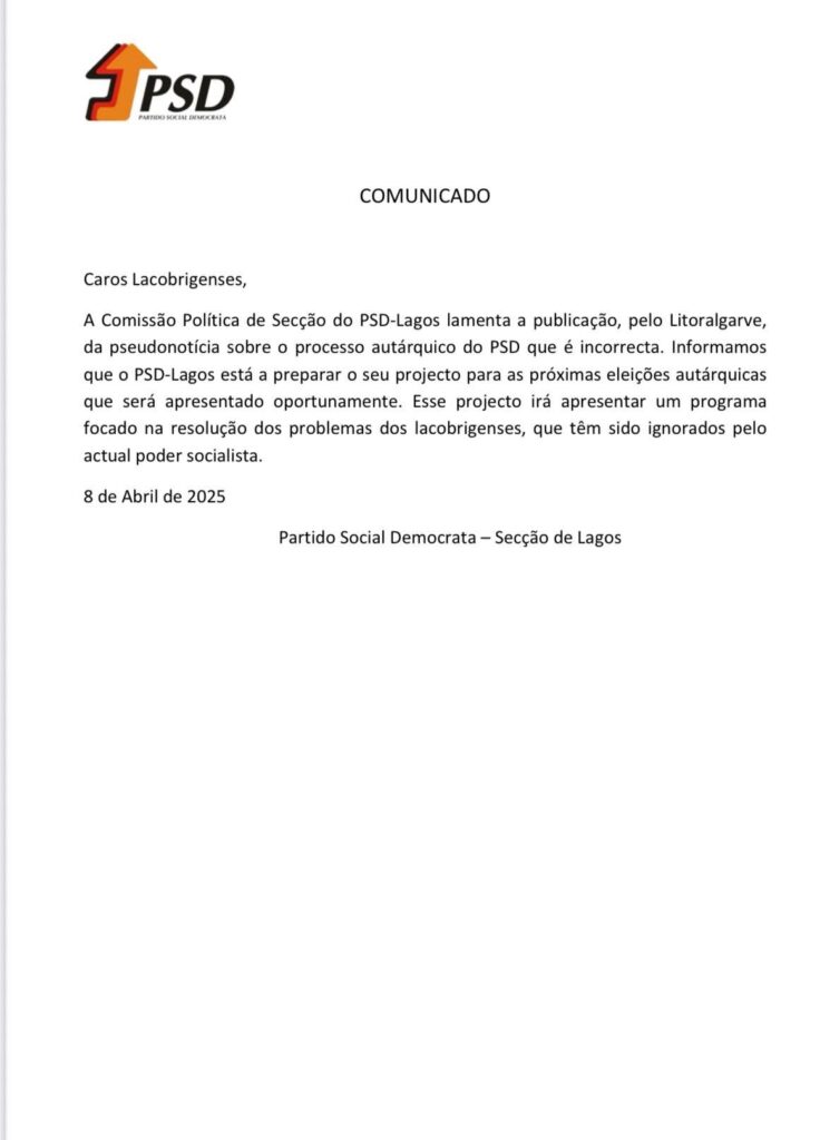 No dia 07 de abril, o Litoralgarve publicou uma notícia informando que o engenheiro Gilberto Viegas apontado como candidato à presidência da Câmara Municipal de Lagos, num “agrupamento” entre PSD, CDS, Iniciativa Liberal .No dia seguinte, o PSD Lagos divulgou um comunicado oficial negando essa informação.