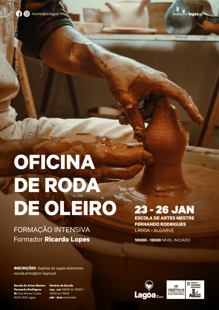 A Escola de Artes de Lagoa – Mestre Fernando Rodrigues irá realizar mais uma formação da “Oficina de Roda de Oleiro” (formação intensiva – nível I) entre os dias 23 a 26 de janeiro, no horário compreendido entre as 10h00 e as 13h30. A formação é de nível iniciado e destinada à população em geral a partir dos 16 anos.