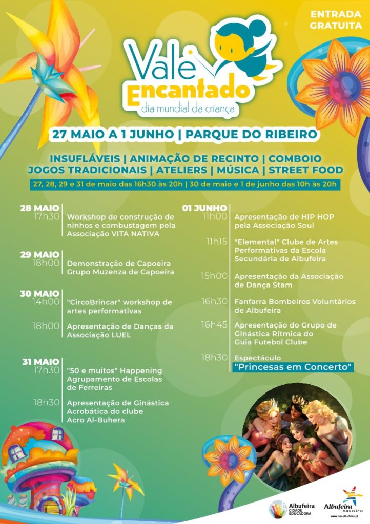 O Parque do Ribeiro vai transformar-se no “Vale Encantado” dos mais novos já a partir da próxima segunda-feira, dia 27, para assinalar em grande as comemorações do Dia Mundial da Criança, organizadas pelo Município de Albufeira. Jogos tradicionais, ateliers, música, “street food”, dança e muito mais, tornarão estes seis dias inesquecíveis, cujo programa termina com o espetáculo “Fantasia – Princesas em Concerto”. Nos dias 27, 28, 29 e 31, o “Vale Encantado” recebe todas as crianças entre as 16h00 e as 20h00. Nos dias 30 de maio e 1 de junho, o horário é entre as 10h00 e as 20h00. “Não há nada mais sério que a brincadeira no desenvolvimento de uma criança”, diz o presidente do Município, José Carlos Rolo. Entrada livre.