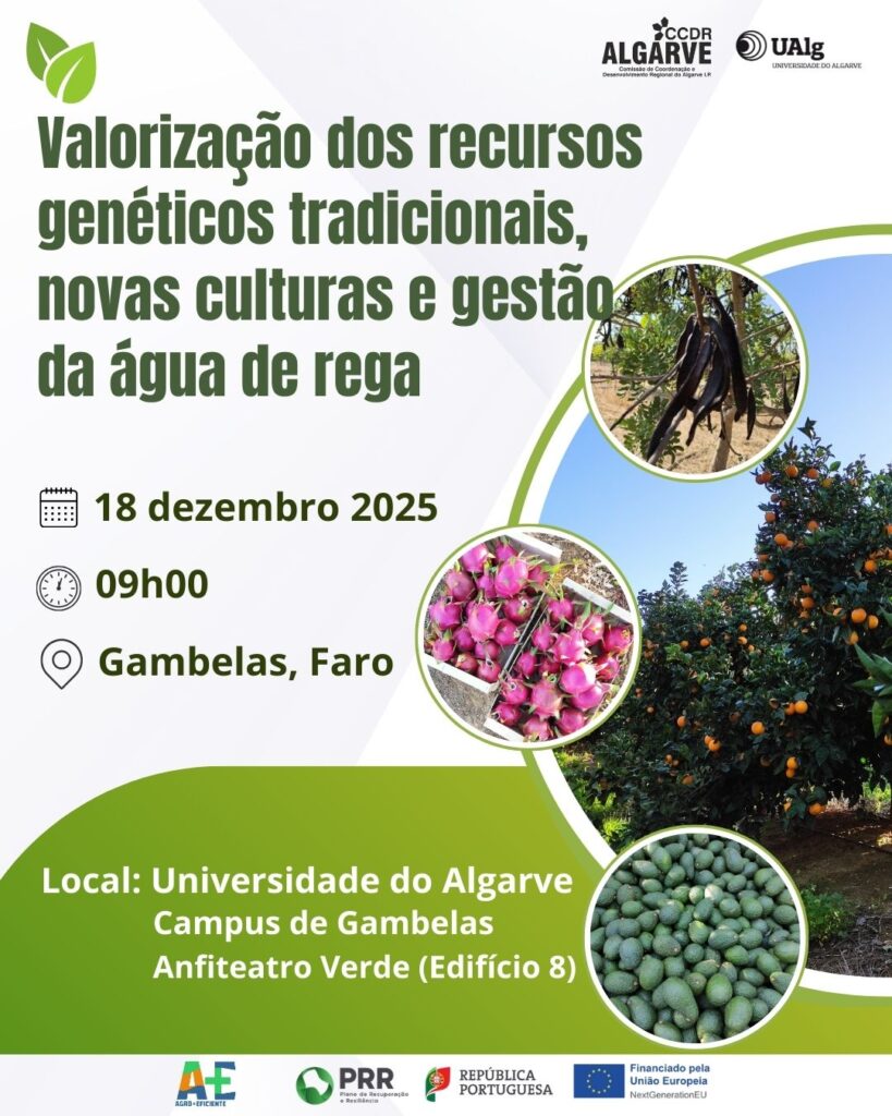 A Comissão de Coordenação e Desenvolvimento Regional do Algarve, I.P. (CCDR Algarve) e a Universidade do Algarve (UAlg) promovem, no próximo dia 18 de dezembro, pelas 09h00, uma sessão dedicada à “Valorização dos recursos genéticos tradicionais, novas culturas e gestão da água de rega”, no Campus de Gambelas – Anfiteatro Verde (Edifico 8) – da Universidade do Algarve.